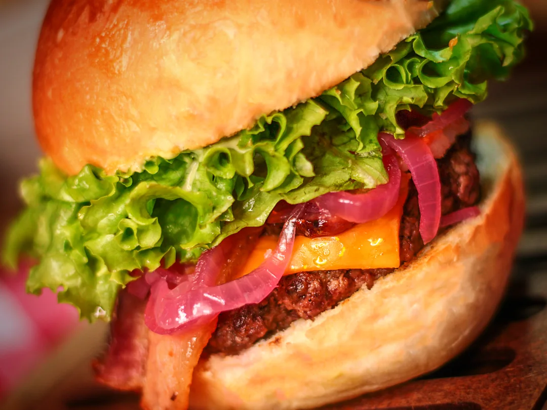O tradicional bem montado: Pão brioche, burger de 100g, bacon, queijo cheddar, maionese da casa, cebola roxa, tomate e alface.