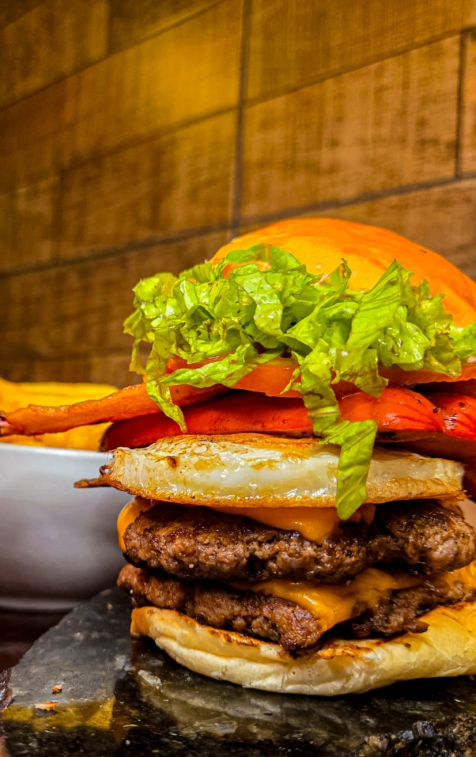 O tradicional bem montado: Pão brioche, burger de 100g, bacon, queijo cheddar, maionese da casa, cebola roxa, tomate e alface.